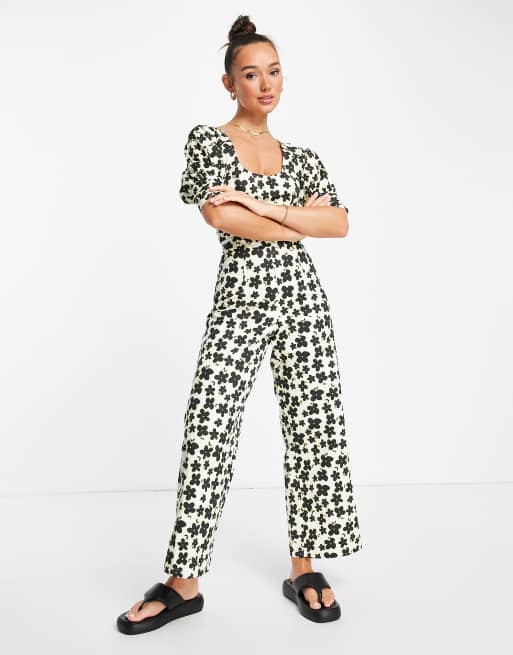 Lost Ink puff sleeve waist detail jumpsuit with tie neck in multi floral