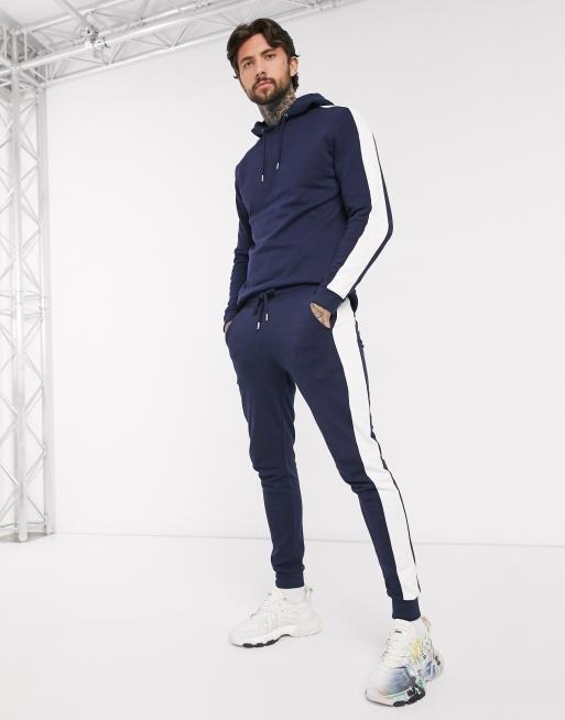ASOS DESIGN tracksuit with hoodie side stripe in navy