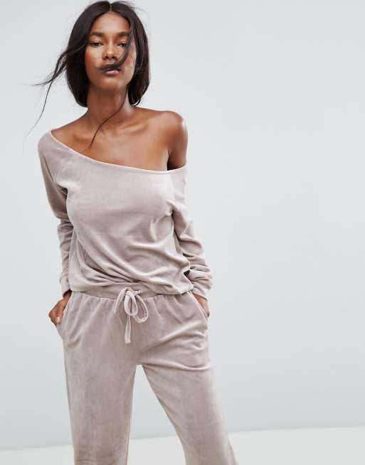 ASOS LOUNGE Velour Off Shoulder Sweat in Nude ASOS