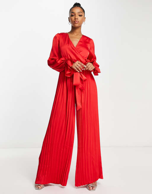 In The Style satin wrap detail pleated wide leg jumpsuit with belt in red
