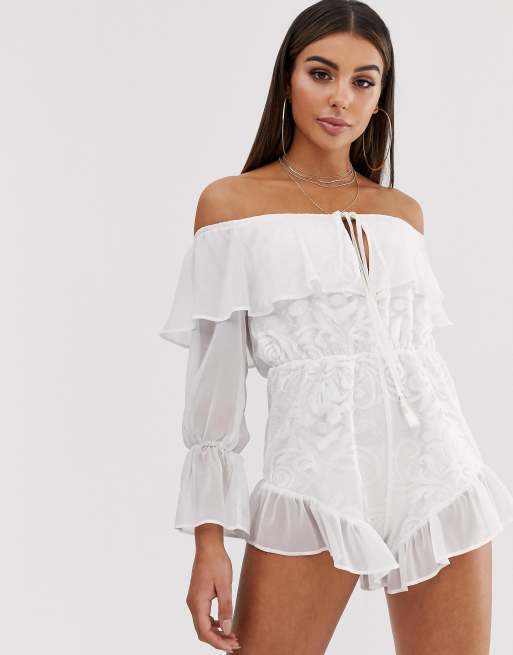 Lasula bardot playsuit with full sleeve and lace overlay in white