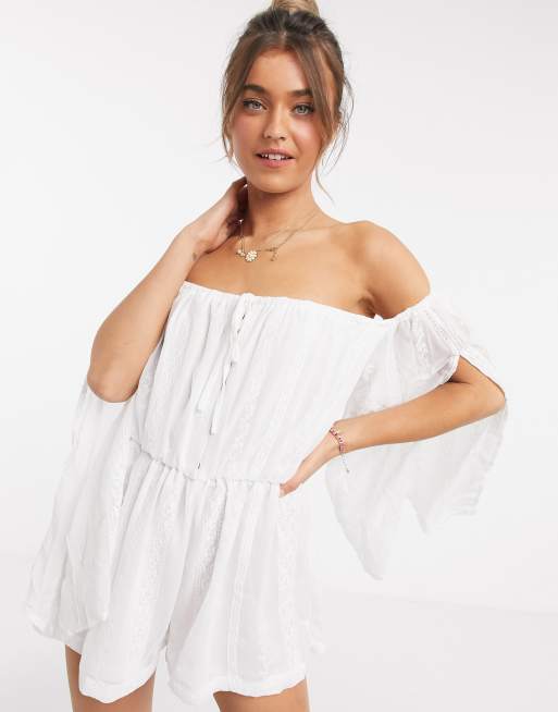 Petite White Poplin Off The Shoulder Playsuit PrettyLittleThing