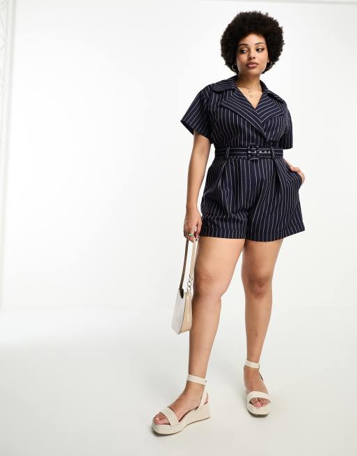 ASOS DESIGN Curve short sleeve tux belted playsuit in pinstripe
