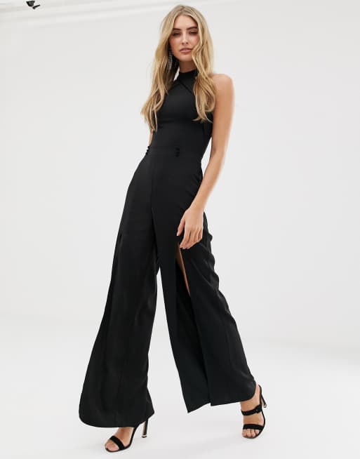 Lipsy halter neck split leg jumpsuit in black ASOS