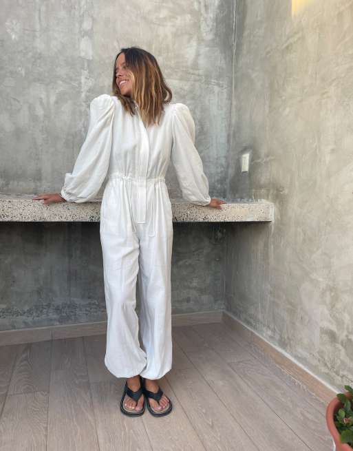 White linen jumpsuit clearance long sleeve