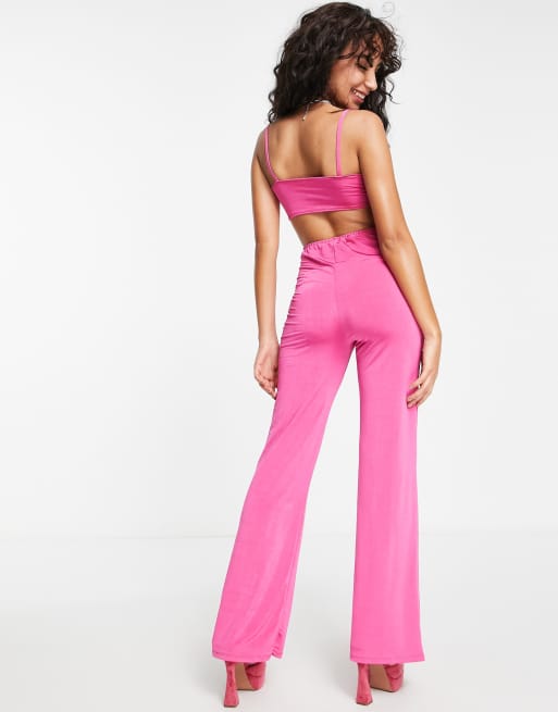 Flounce London Petite satin cut out flared jumpsuit in hot pink ASOS