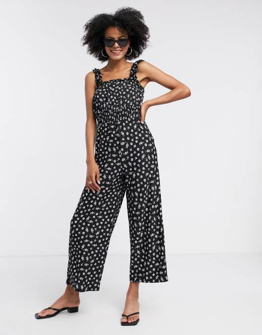 Topshop shirred jumpsuit in black floral