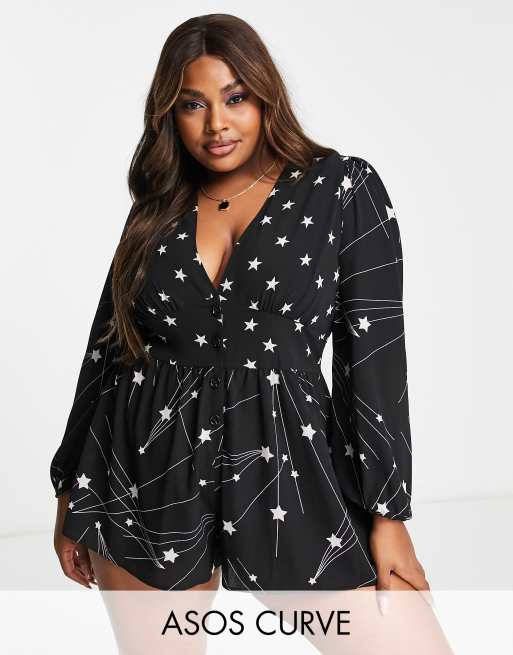 ASOS DESIGN Curve volume sleeve plunge beach playsuit in black ASOS