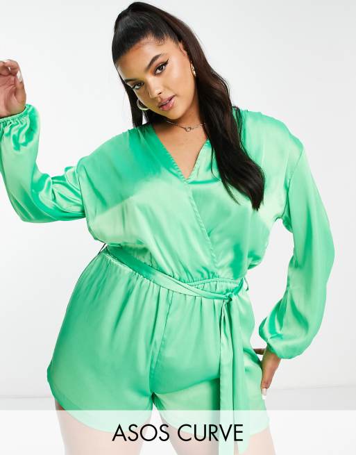 ASOS DESIGN Curve bubble crepe plunge neck playsuit with puff