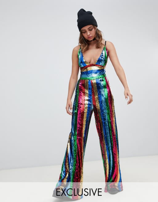 One Above Another wide leg plunge jumpsuit in rainbow stripe sequin
