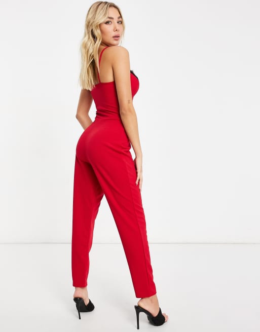 Red jumpsuit skinny clearance leg, Compact Stretch Bow Bodice Slim Leg Jumpsuit Karen Millen clearance