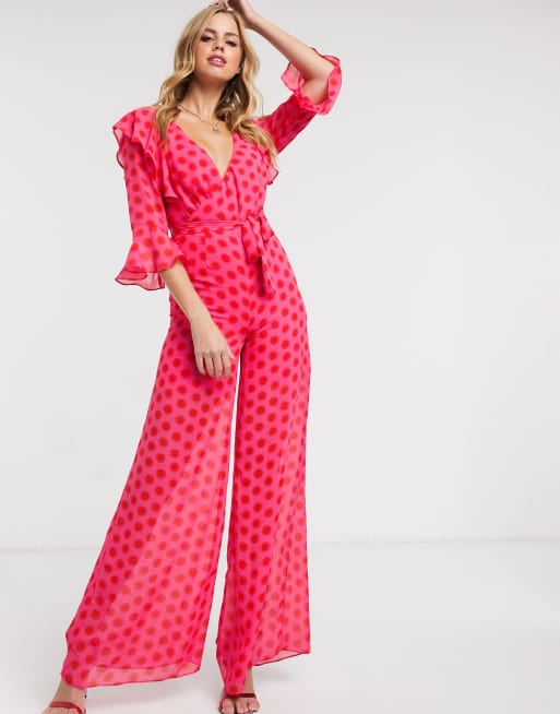 Dark Pink plunge front jumpsuit in red and pink spot print