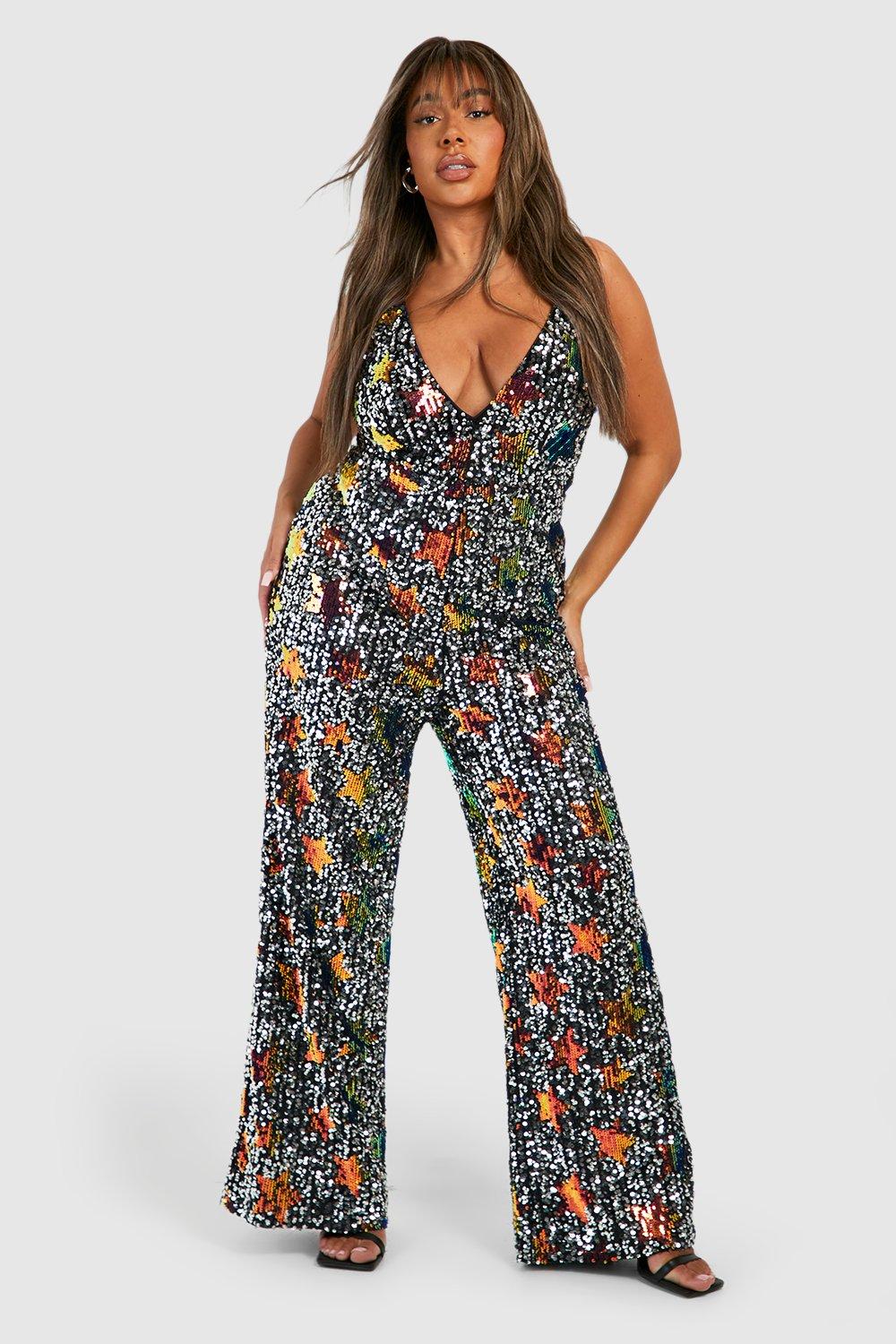 Women s Plus Star Sequin Strappy Wide Leg Jumpsuit Boohoo UK
