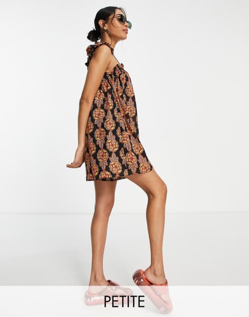 Topshop Petite channel frill shoulder printed playsuit in multi