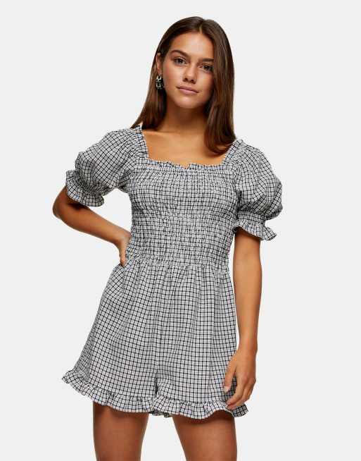 Topshop petite playsuit with puff sleeves in monochrone gingham