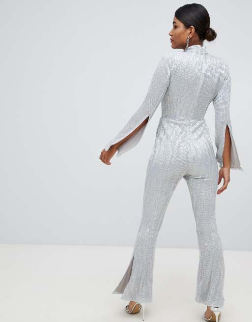 Lavish Alice sequin embellished plunge jumpsuit in silver