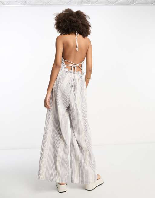 Asos clearance striped jumpsuit, ASOS DESIGN crinkle frill halterneck jumpsuit with wide leg in stripe clearance