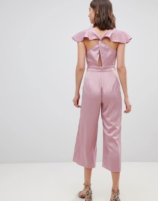 Warehouse frill sleeve twist back jumpsuit in pink ASOS