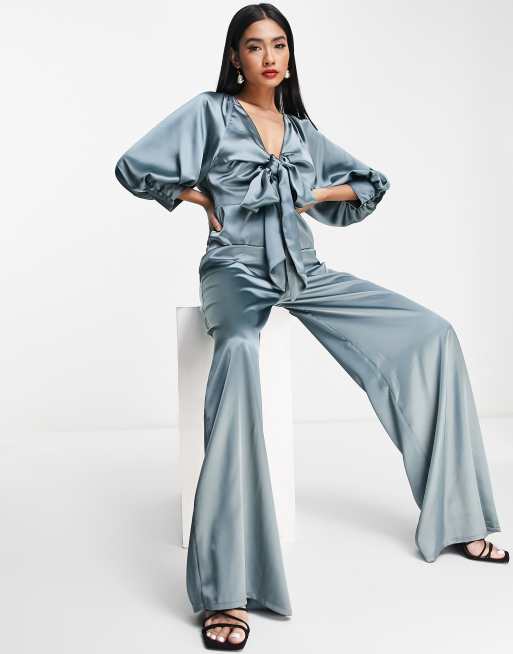 ASOS DESIGN satin tie front wide leg jumpsuit in teal gray ASOS
