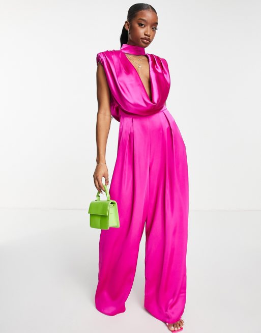 ASOS LUXE satin jumpsuit with shoulder pads and cowl neck in pink