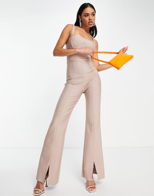 Band Of Stars premium square neck bandage jumpsuit with zip back in stone
