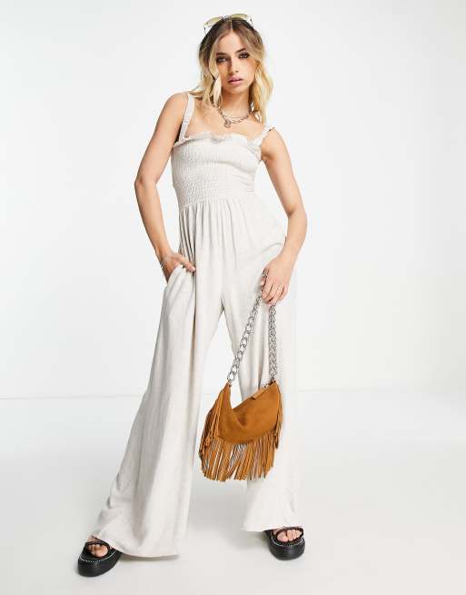 Topshop linen shirring jumpsuit in natural beige ASOS