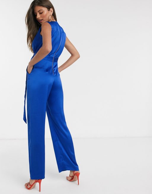Amiah Cobalt Blue Satin Strapless Straight Leg Jumpsuit Club L