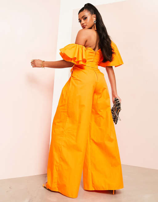 Off shoulder yellow clearance jumpsuit, ASOS LUXE one shoulder belted poplin jumpsuit in orange ASOS clearance