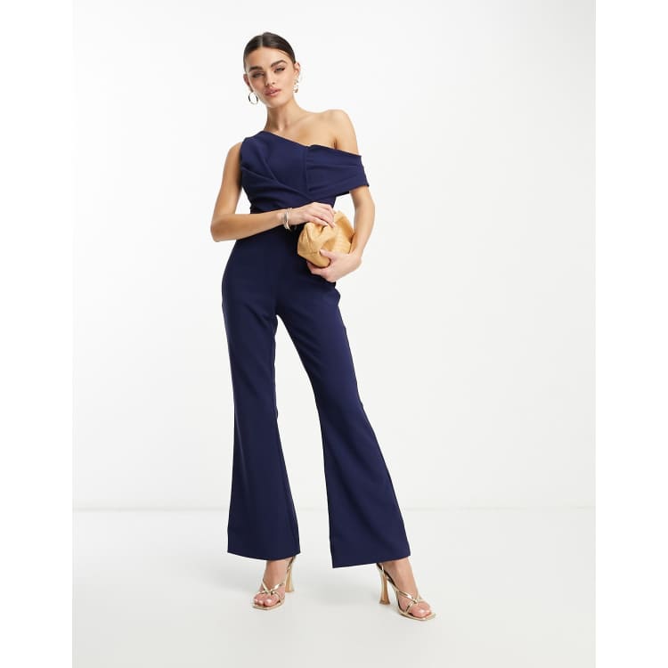 Lavish Alice off shoulder flared jumpsuit in navy blue