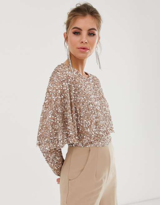 Maya cape detail jumpsuit with tonal delicate sequin top in taupe