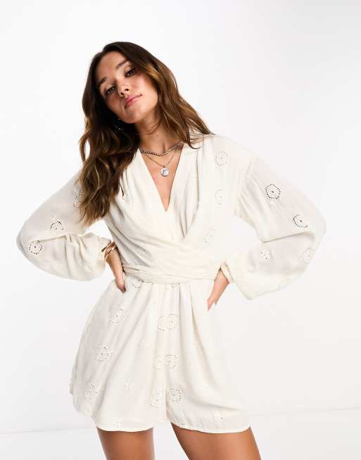 River Island balloon sleeve embroidered playsuit in cream ASOS