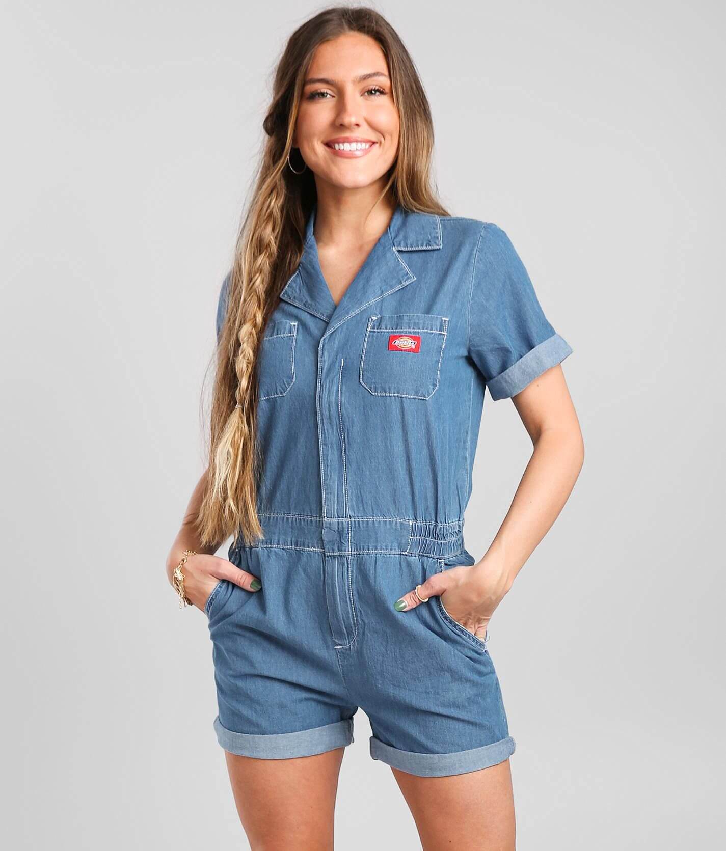 Dickies Cuffed Denim Overall Short Women s Rompers Jumpsuits in