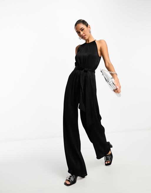 Other Stories sleeveless wide leg jumpsuit with tie detail in shimmer crinkle black