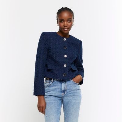 River island tweed clearance jacket womens, River Island Womens Navy Boucle Crop Trophy Jacket 70.00 clearance