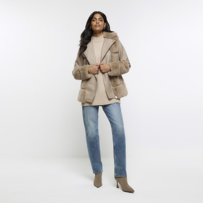 River island faux clearance fur coat womens, Cream faux fur belted biker jacket River Island clearance