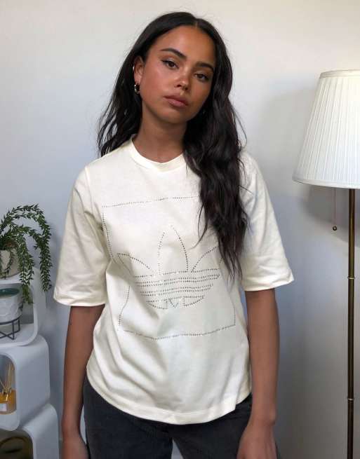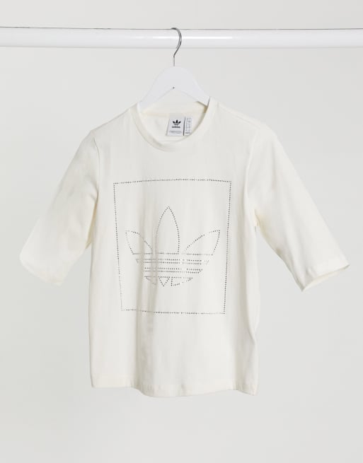 adidas Originals 2000s Luxe cropped t shirt in camel with central rhinestone logo