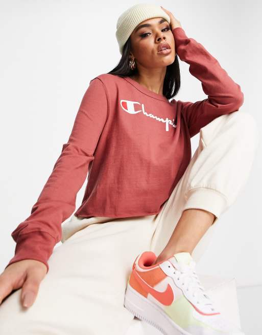 Red champion long clearance sleeve shirt womens, Champion cropped long sleeve top with large logo in tan ASOS clearance