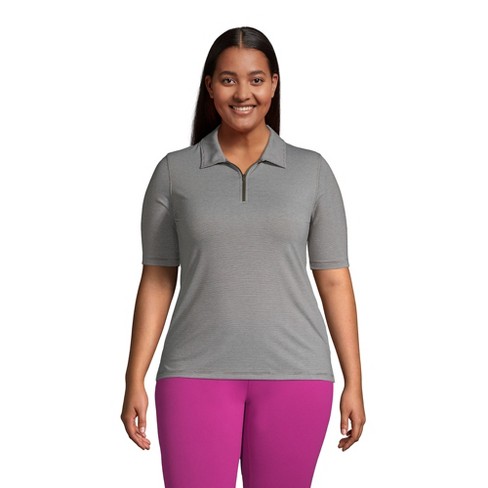 Lands End Women s Plus Size Moisture Wicking UPF Sun Elbow Sleeve Zip Front Polo Shirt 1x Forest Moss Pinstripes