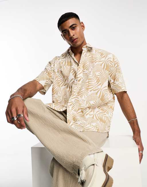 Selected Homme short sleeve linen shirt in white with palm print