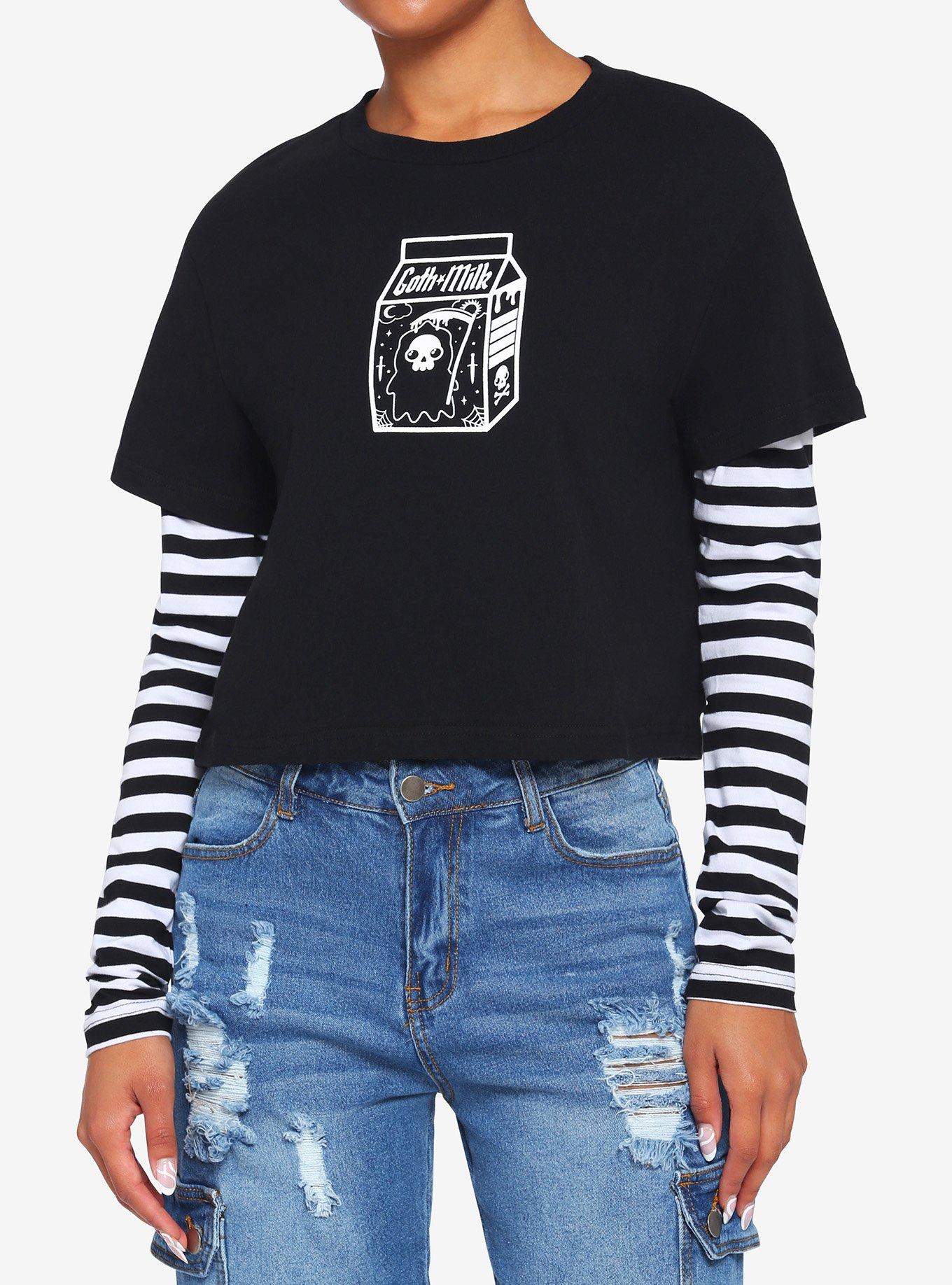Goth Milk Black White Twofer Girls Crop Long Sleeve T Shirt