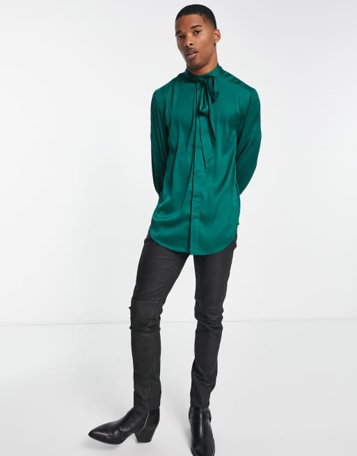 ASOS DESIGN satin shirt with tie neck and blouson volume sleeve in jewel green