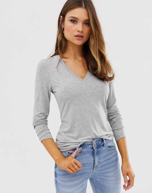 ASOS DESIGN v neck long sleeve t shirt in gray marl