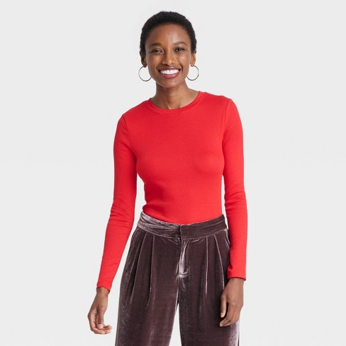 Women s Slim Fit Long Sleeve Ribbed Crewneck T Shirt A New Day Red XL