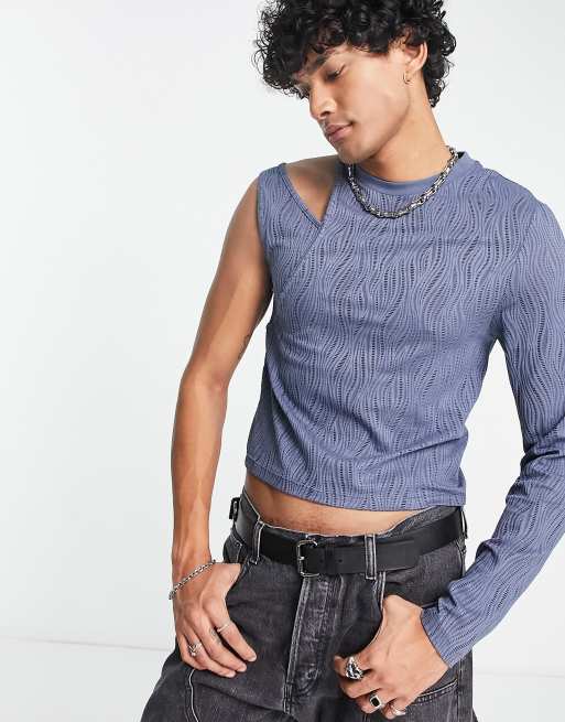 ASOS DESIGN skinny crop long sleeve T shirt in gray texture with one sleeve and cut outs