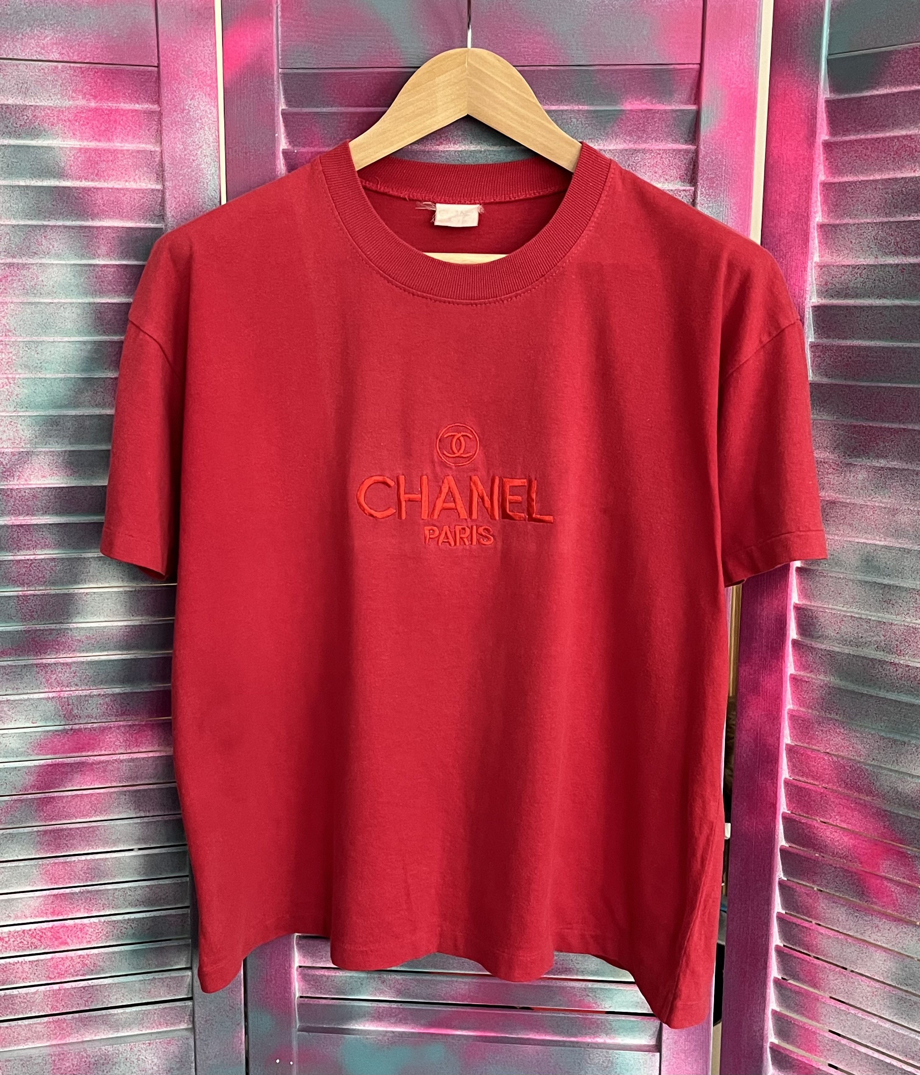 Vintage Chanel Paris T Shirt Red Embroidery Big Logo 90s
