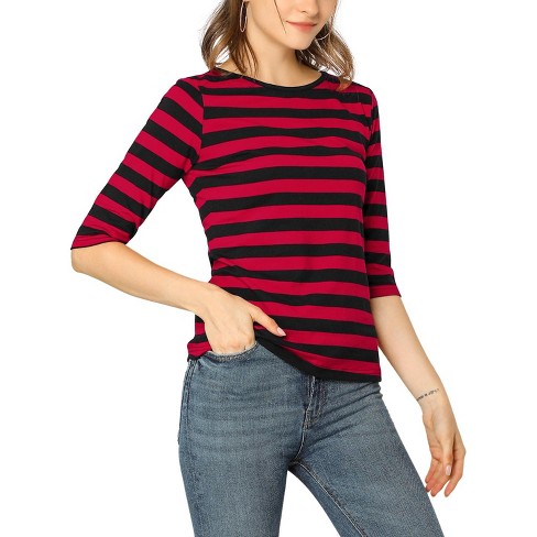 Striped long sleeve shirt red clearance and black, Allegra K Women s Elbow Sleeves Boat Slim Fit Casual Printed T clearance
