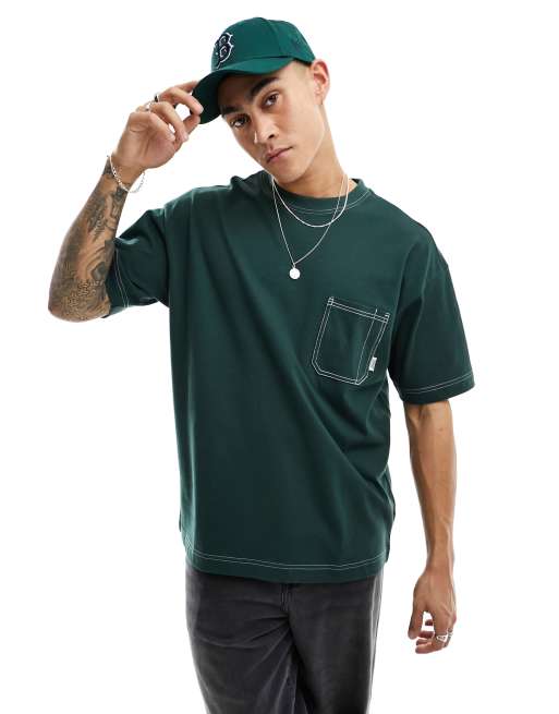 Cotton On boxy fit t shirt with pocket and seam detail in forest green