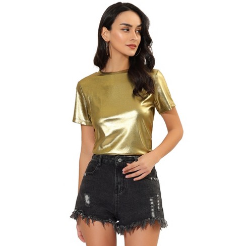 Allegra K Women s Party Metallic Textured Short Sleeve Shiny T shirts Gold Small