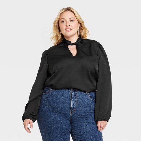 Women s Slim Fit Balloon Long Sleeve Keyhole Blouse Ava Viv Black 1X