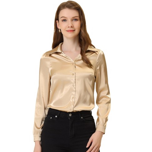 Allegra K Women s Work Office V Neck Long Sleeve Button Satin Shirt Blouse Golden Brown Medium